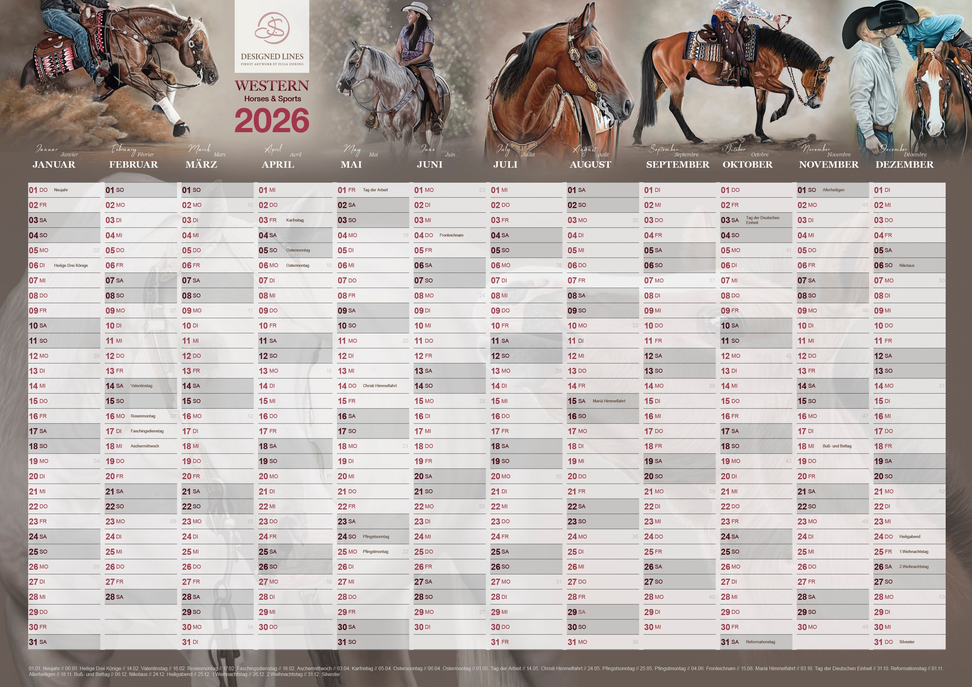 Passend zum Kunstkalender Western Horses & Sports 2025gibt es auch den praktischen Wandplaner. Mit seinen Maßen im Din Format A1 (841 x 594mm) passt er super auch an jede Bürotür.